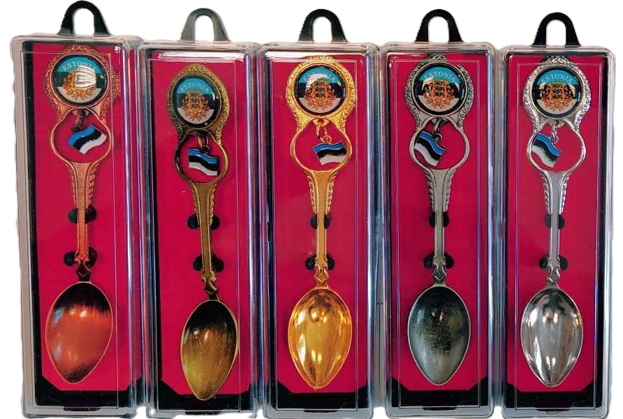 Eesti vapi ja lipuga kaunistatud hõbedase-, pronksi- ja kullaläikega metallist lusikad. Hinna sees ka karp.