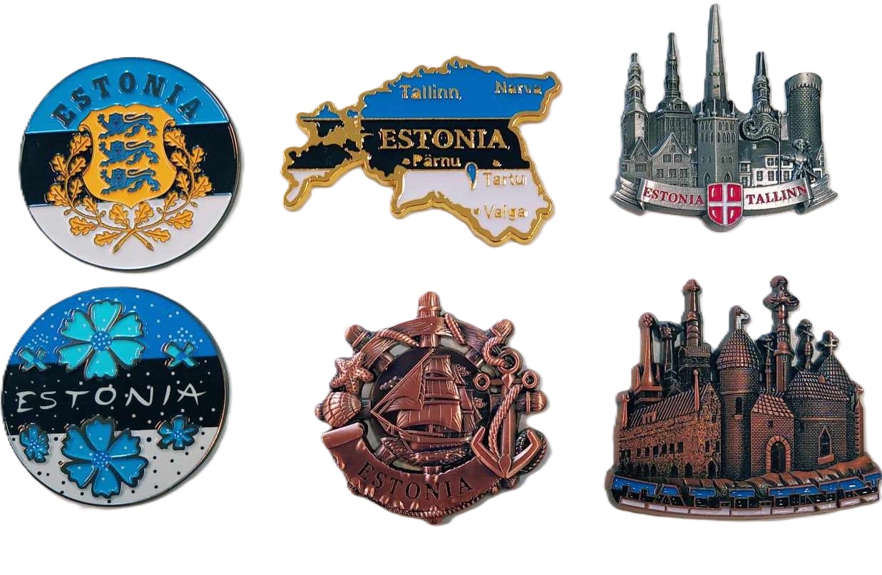 Metallist email magnetid Eesti ja Tallinna vaatamisväärsuste kujutistega.