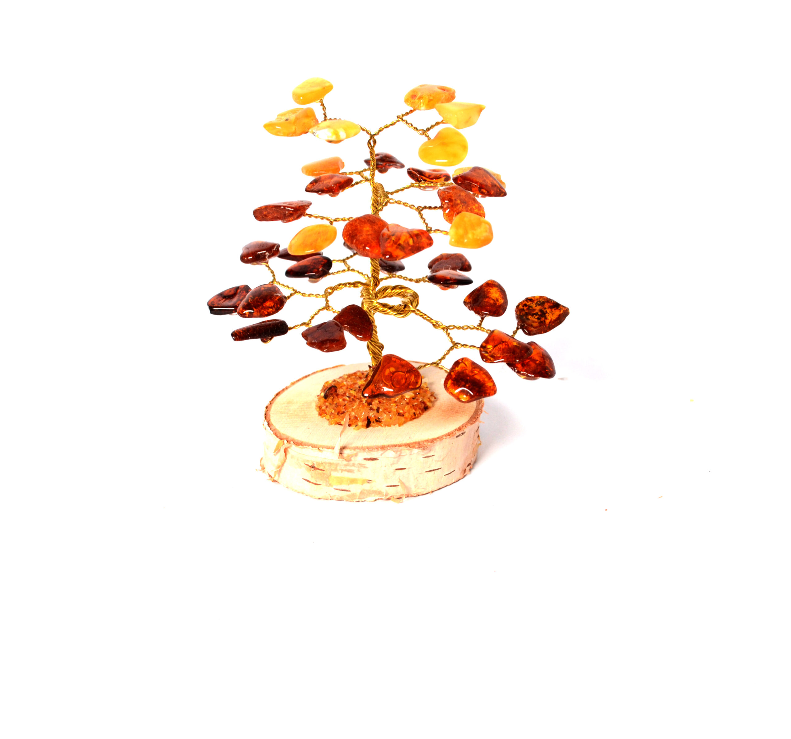 Merevaigupärlitest käsitsivalmistatud dekoratiivpuu 36pärliga puidust alusel.
