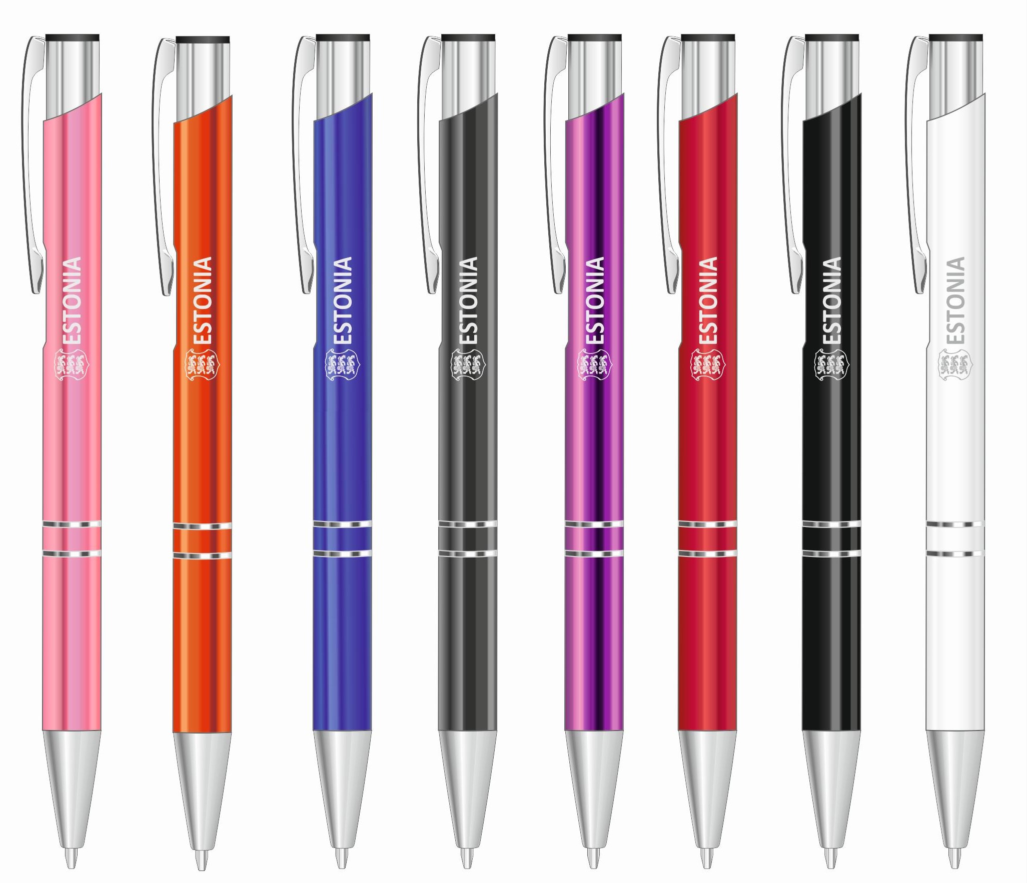 Metallist erivärvilised pastakad kuhu on graveeritud eesti vapp ja kiri Estonia